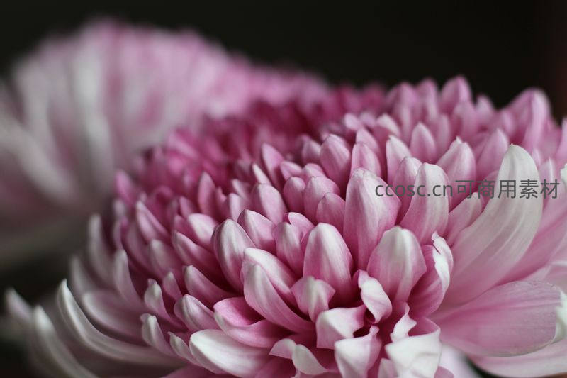 粉色与白色相间的菊花花瓣在微距镜头下展现其柔美的曲线与细腻的层次,背景虚化更凸显了花朵的温柔与宁静感。