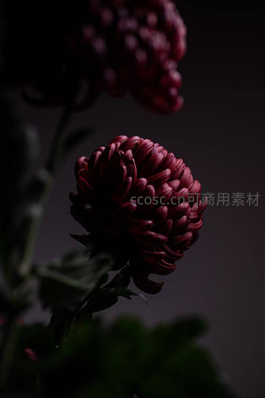 暗调背景下深红色菊花的静谧之美