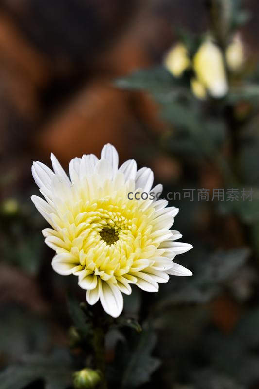一朵洁白的菊花在虚化背景中独自绽放,中心泛黄的花蕊与洁白的花瓣形成温柔对比,传递出宁静而清新的自然美感。