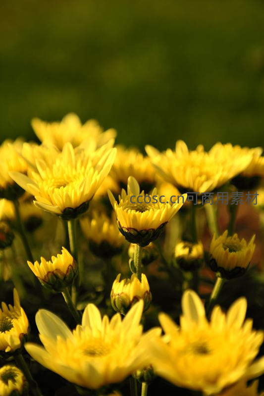 一片金黄色的菊花在温暖阳光下随风轻摇,背景是柔焦的绿色田野,营造出如梦似幻、充满诗意的田园风光景象。