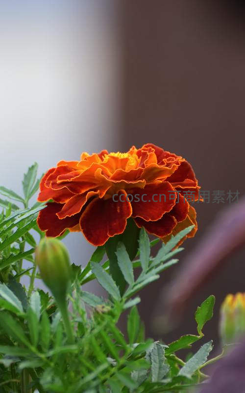 一朵深红色万寿菊在翠绿叶片的衬托下傲然绽放,旁边还有一枚青涩花苞,展现了生命从含苞到盛放的细腻过程。