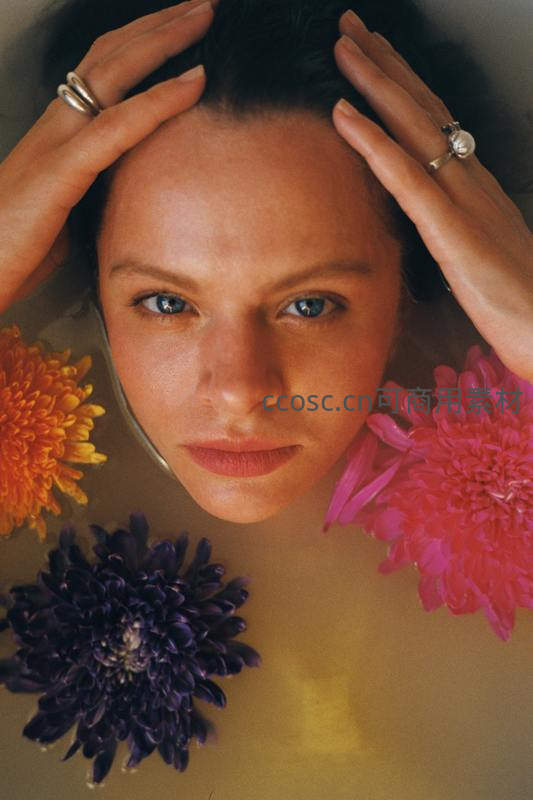一位女子在水中仰望镜头,双手轻抚发际,周围漂浮着色彩斑斓的菊花,营造出宁静而唯美的氛围。