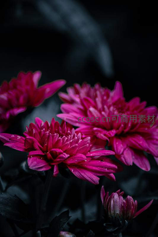 几朵深红色菊花在黑暗背景中绽放,花瓣上挂着晶莹水珠,散发出神秘、浓烈且富有艺术感的气息。