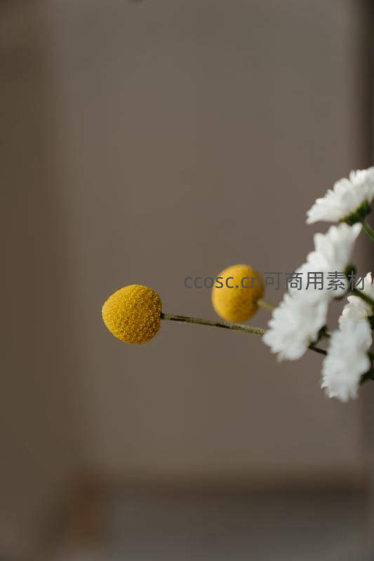 两颗饱满的黄色球状花蕾与洁白雏菊枝条相依,背景柔和朦胧,构图简洁,营造出宁静雅致的室内美学意境。