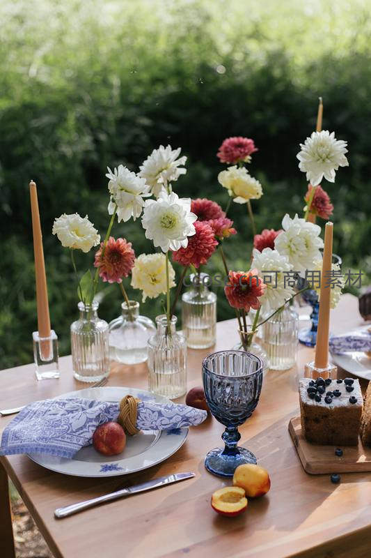 阳光洒在木质餐桌上,白色与红色的鲜花、新鲜水果和蓝莓蛋糕错落有致,营造出温馨浪漫的户外用餐氛围。