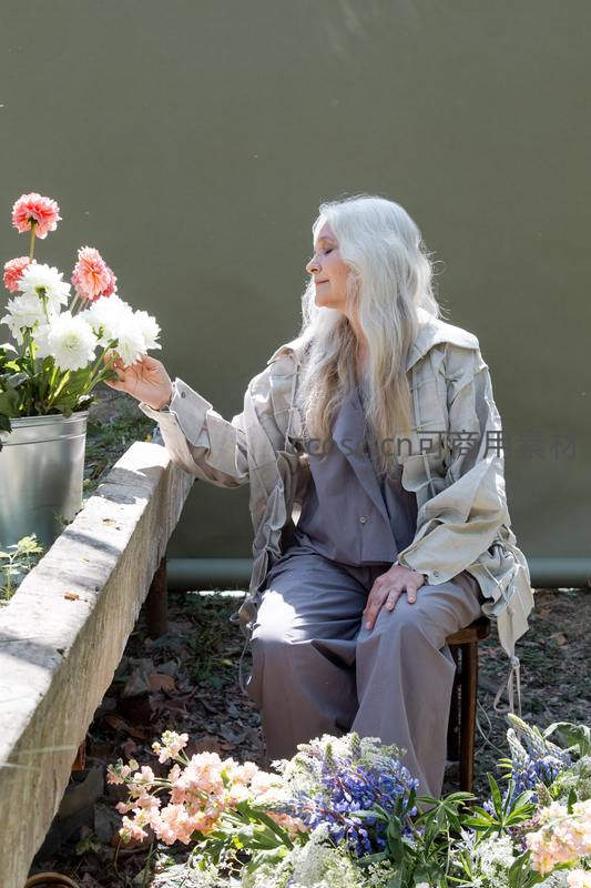 一位银发女士身着米色风衣,在花园中静坐赏花,神情安详,周围繁花盛开,尽显岁月静好的诗意生活。
