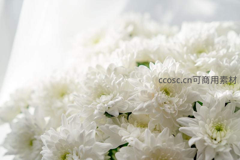 微距镜头捕捉盛开的白色菊花,层层叠叠的花瓣在柔和的自然光下显得格外纯净细腻,浅景深效果模糊了背景,突显了花朵本身的优雅与宁静之美。