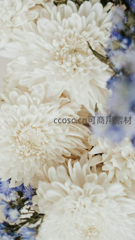 洁白饱满的菊花与朦胧蓝色小花相映成趣,构图简洁,色彩柔和,传递出宁静素雅的视觉美感。