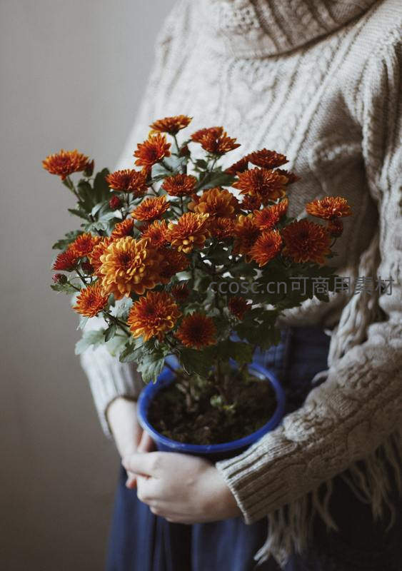 一位穿着米色针织毛衣的女子,双手轻柔地捧着一盆盛开的橙红色菊花,背景简洁,氛围温暖宁静。