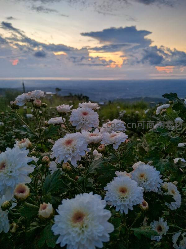 广阔田野上洁白菊花随风轻摇,背景是绚烂晚霞与远山轮廓,构成一幅宁静诗意的自然风光画卷。