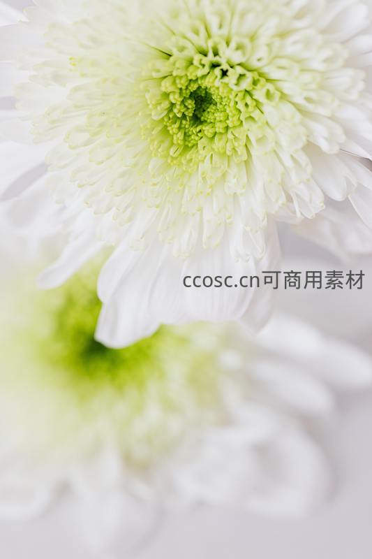 两朵白色菊花前后叠映,前景清晰展现绿心与柔美花瓣,背景虚化营造空间感,构图优雅富有层次。
