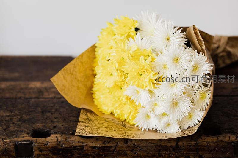 黄白菊花束置于复古木桌上的静物