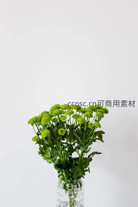 一支充满生机的绿色菊花被插在透明的泡泡玻璃花瓶中,纯白背景突显其自然形态,是极简主义风格的完美诠释。