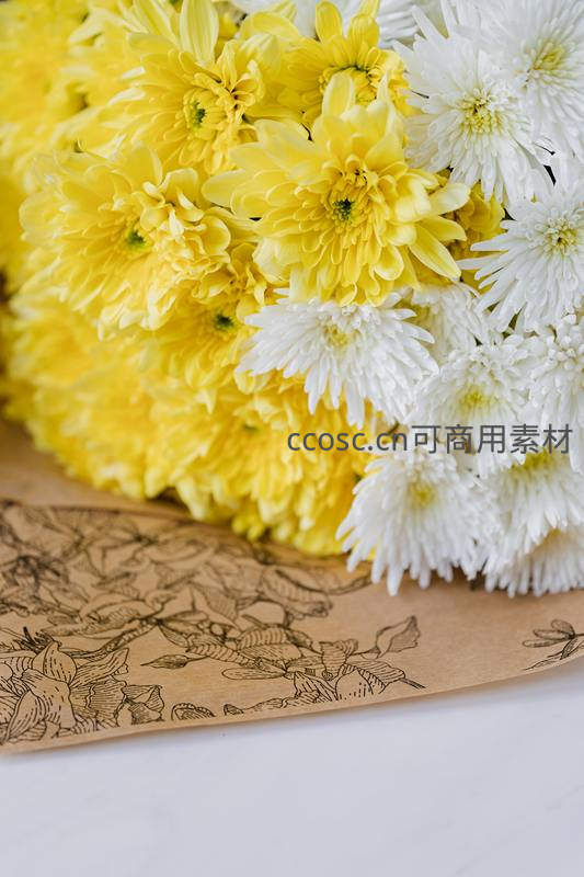 黄白菊花束与花卉图案包装纸的细节