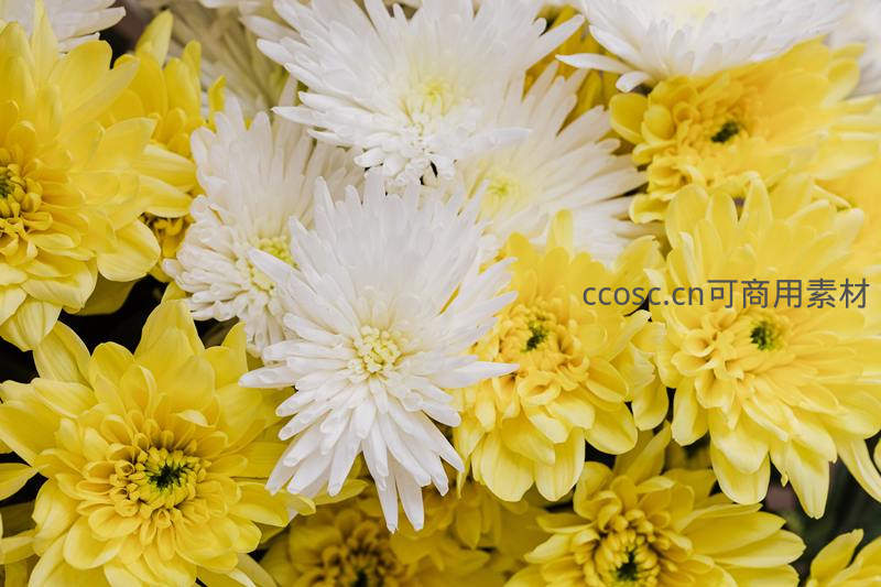 黄色与白色菊花交织盛开,色彩鲜明对比强烈,充满生命力,是秋季花园中一道亮丽的风景线。