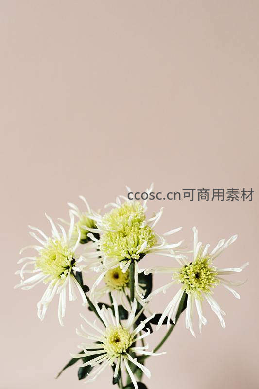 几支淡雅的菊花在素净背景前静静绽放,线条柔美,营造出宁静、清新的室内装饰氛围。