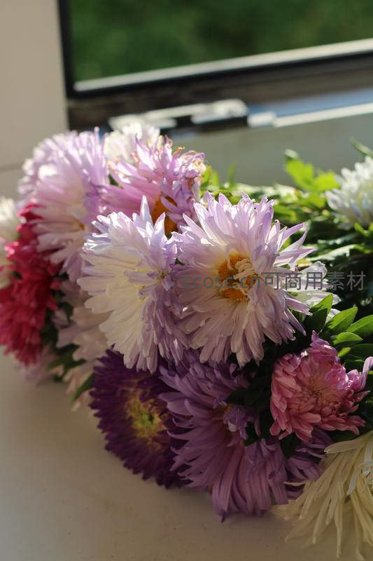 紫色与粉色菊花在窗边接受阳光照射,光影交错,营造出温馨舒适的居家氛围,色彩丰富而柔和。