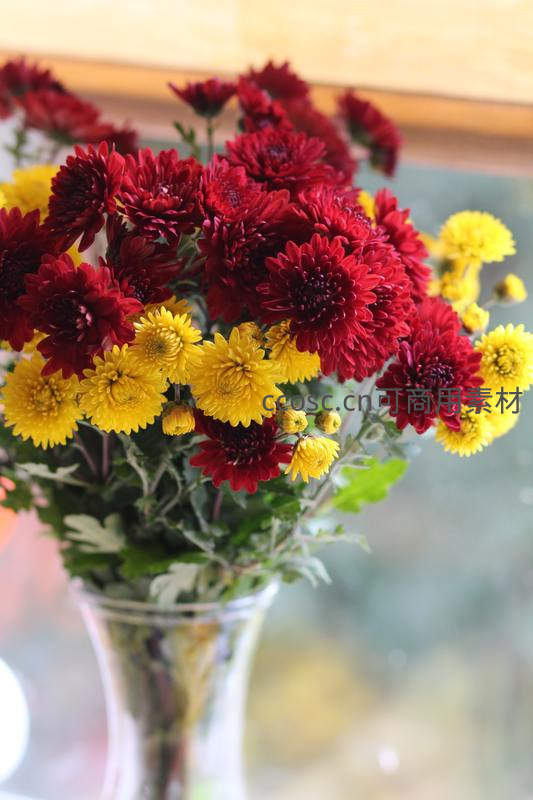 红色与黄色菊花交织成簇,置于透明玻璃花瓶中,背景柔和模糊,突显花朵的饱满与色彩的热烈。