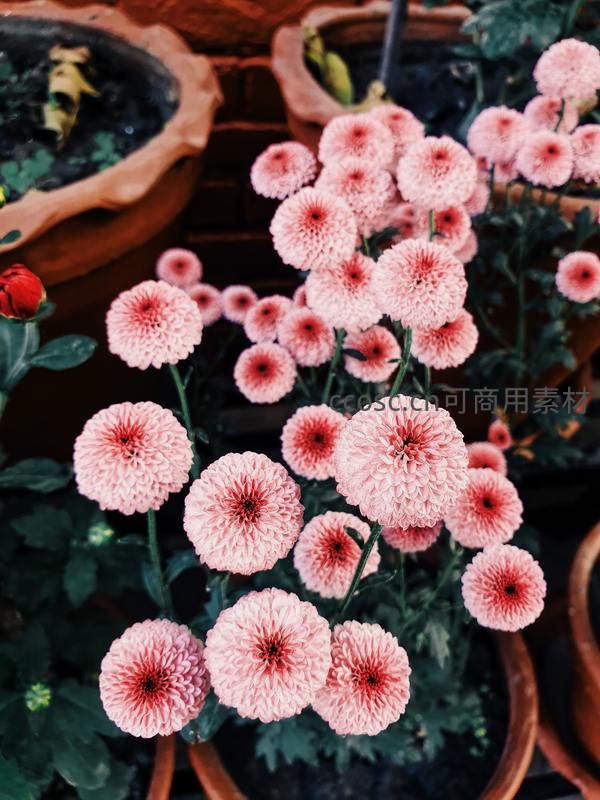 粉红菊花盆栽绽放于陶盆之中