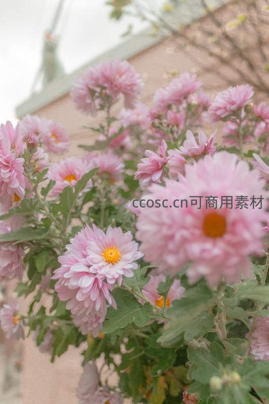 柔美的粉色菊花在庭院中静静绽放,花瓣层层叠叠,中心金黄,与翠绿叶片相映成趣,营造出温馨宁静的春日氛围。