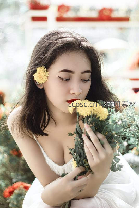 一位年轻女子身着白色吊带裙,在花园中轻嗅手中黄菊,发间别着同色花朵,妆容精致,神情宁静,背景虚化营造出梦幻氛围。