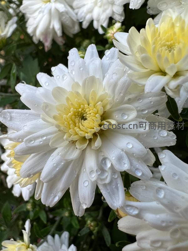 洁白的菊花上缀满晶莹露珠,花瓣舒展,花心淡黄,在晨光下显得格外清新湿润,充满自然诗意。