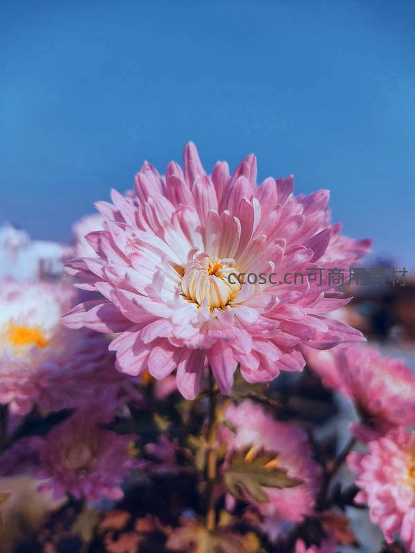 在湛蓝天空背景下,一朵粉嫩菊花迎风绽放,花瓣轻盈,花蕊微黄,整体画面明媚动人,充满春日气息。