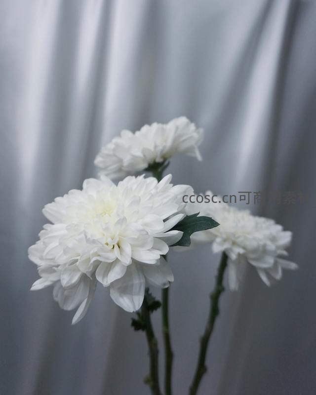 三朵洁白菊花在灰色布幔前静静伫立,枝干挺拔,花瓣丰盈,营造出极简而富有诗意的视觉空间。