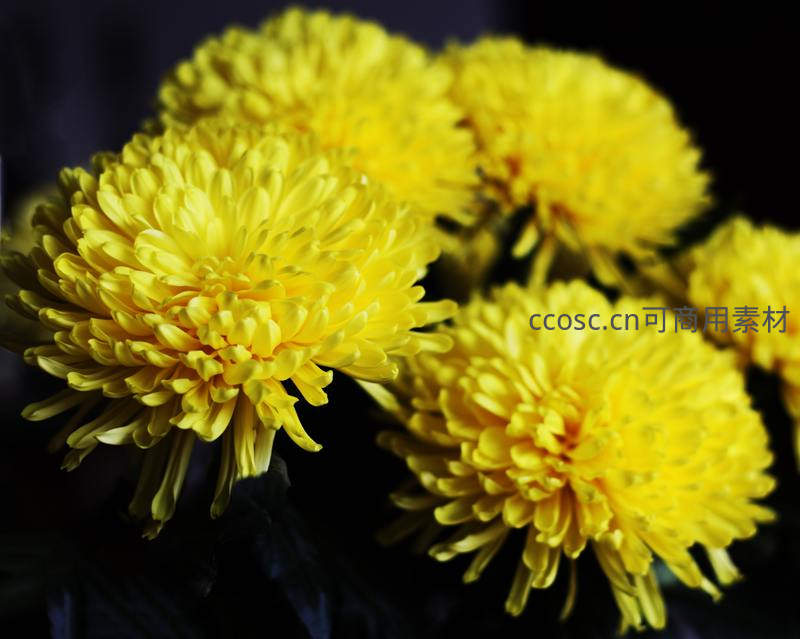 数朵饱满的金黄色菊花在深色背景下绽放,色彩明艳夺目,充满活力与温暖,仿佛阳光洒落于花丛之中。