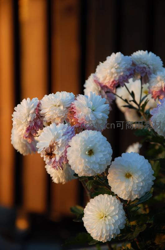 夕阳余晖温柔地洒在洁白的菊花上,部分花瓣泛着淡淡的粉晕,背景木质纹理模糊,营造出宁静而诗意的氛围。