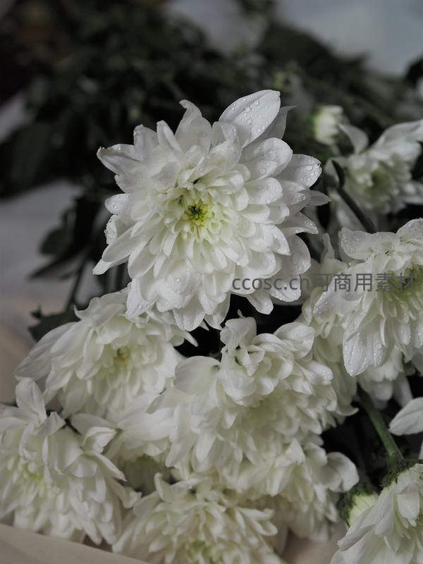 洁白的菊花花瓣上缀满晶莹水珠,在柔和光线下闪烁,绿叶衬托,整体画面清新脱俗,充满自然的纯净美感。