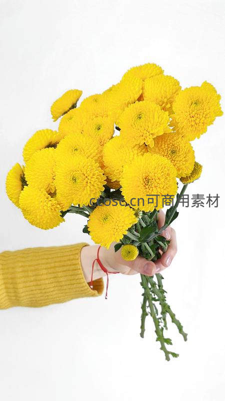 一束鲜艳的明黄色菊花被穿着黄色毛衣的手温柔握住,手腕系着红绳,简洁背景衬托出花朵的活力与温暖气息。