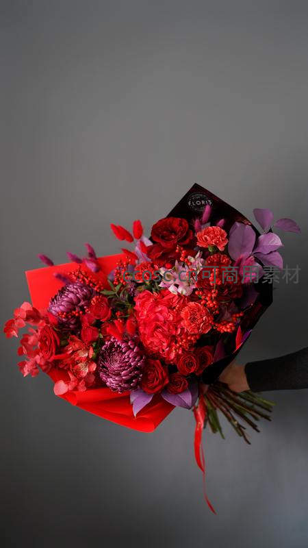 一束以红紫为主色调的精美花束,由玫瑰、康乃馨等组成,搭配黑色礼盒与红色丝带,充满节日与浪漫气息。