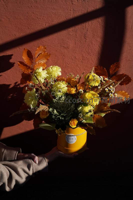 黄色圆筒中盛放着黄橙色调的秋菊与干叶,在红墙背景下被斜射阳光勾勒出明暗对比,呈现温暖而富有艺术感的画面。