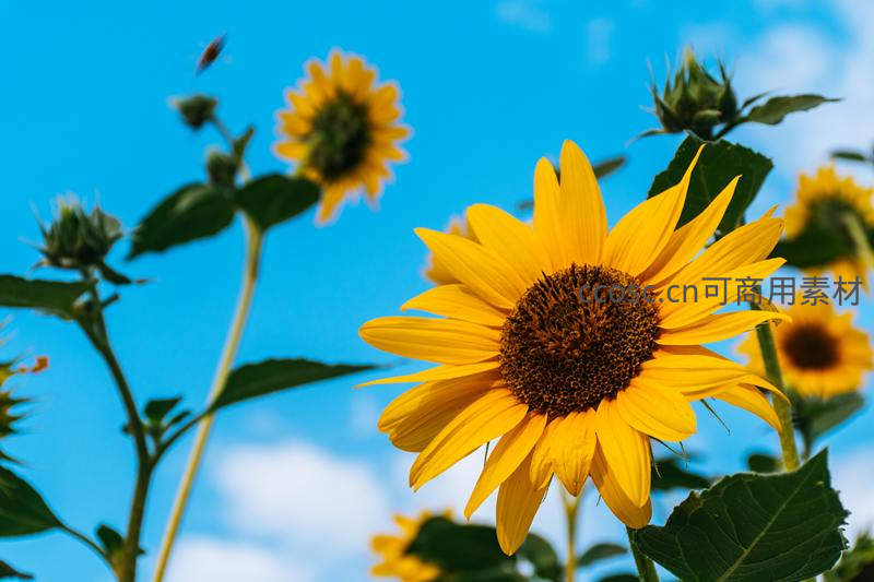 一朵盛开的向日葵在蔚蓝天空下迎风绽放,金黄色的花瓣层层叠叠,深褐色的花盘细节清晰可见,旁边还有含苞待放的花蕾,展现了生命的蓬勃与活力。