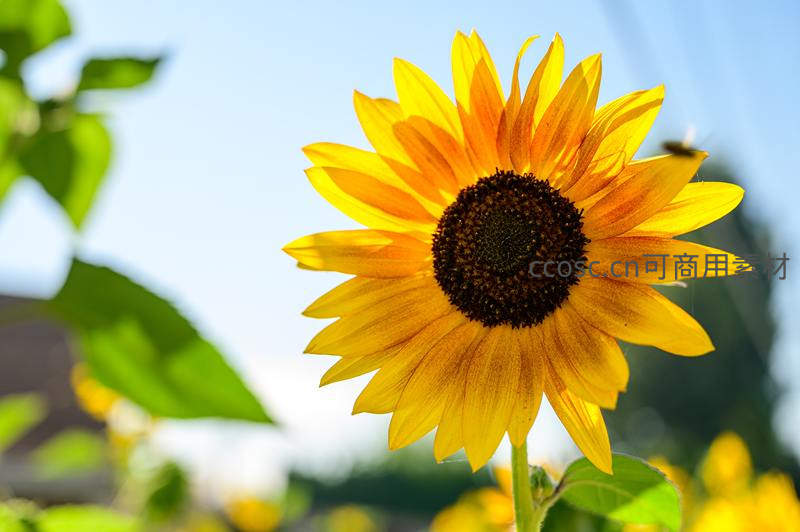 微距镜头捕捉到一朵向日葵的细腻纹理,一只蜜蜂正从花旁飞过,金黄的花瓣在阳光下熠熠生辉,绿叶作为背景虚化,营造出动态而生动的自然生态瞬间。