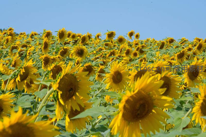 无垠的向日葵花田在蔚蓝天空下竞相绽放,金黄色的花朵铺满大地,构成一幅充满生机与活力的夏日田园画卷,令人心旷神怡。