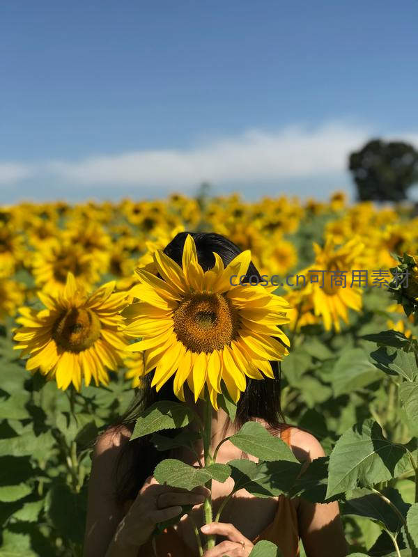 一位少女置身于无边的向日葵花海,金黄花瓣与蓝天相映,她手持花朵,姿态优雅,尽显自然与人文的和谐之美。