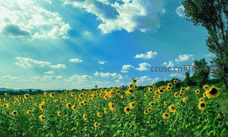 阳光穿透云层洒落在广阔的向日葵田野上,绿叶与黄花交相辉映,远处树木和山峦勾勒出宁静祥和的田园画卷。