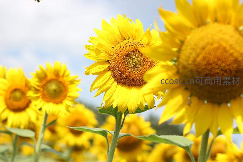 几朵向日葵在微风中摇曳,蜜蜂与蝴蝶在其间忙碌穿梭,生动展现了自然界中花朵与昆虫和谐共生的美好瞬间。