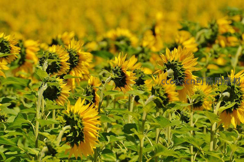 一片广阔的向日葵花田在阳光下盛放,金黄色的花瓣与翠绿的叶片交织,构成一幅生机勃勃的田园画卷。