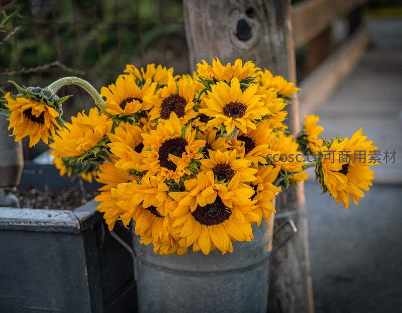 一束鲜艳的向日葵插在复古金属桶中,背景是木质围栏和模糊绿植,整体画面充满田园气息与生活情调。
