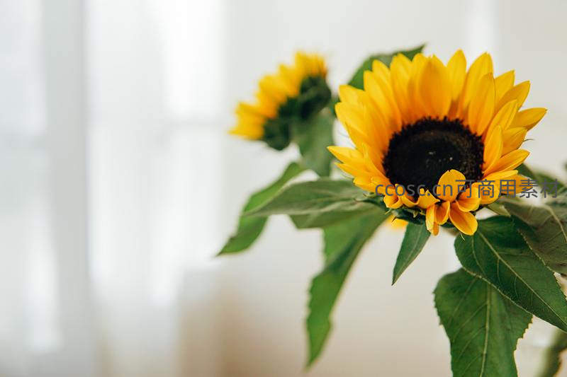 两朵向日葵置于窗前,柔和光线洒落其上,绿叶衬托出花朵的活力,营造宁静舒适的居家氛围。