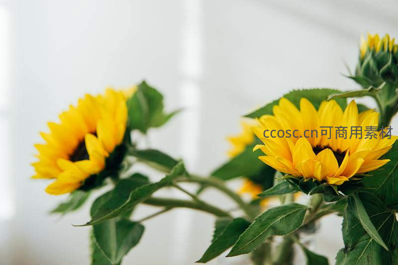近距离拍摄的向日葵,金黄的花瓣与翠绿的叶子相映成趣,展现了花朵旺盛的生命力和自然之美。