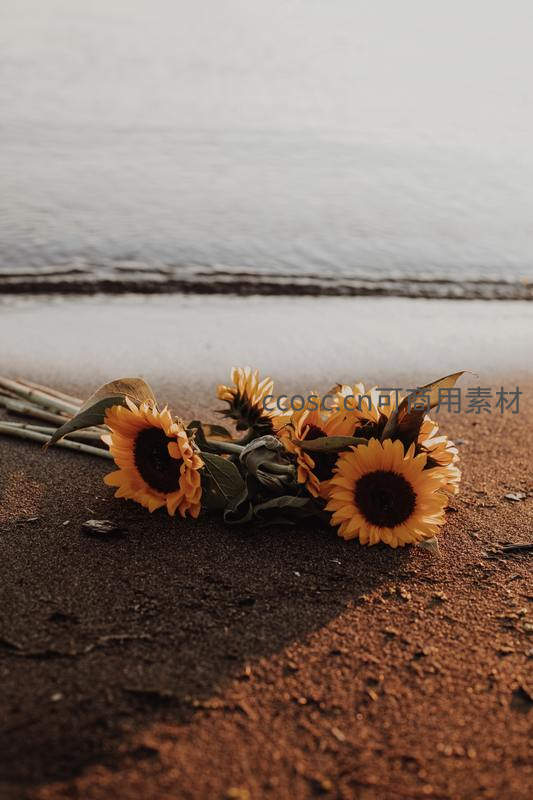 一束略显枯萎的向日葵静静躺在湿润的沙滩上,背景是平静的水面,传递出一种温柔而略带忧伤的意境。