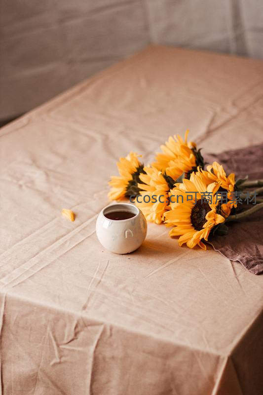 一束明艳的向日葵与一杯热饮置于素色桌布之上,营造出宁静温暖的居家氛围,是日常生活中的一抹亮色。