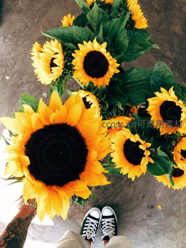 以第一人称视角拍摄,脚下是经典帆布鞋,手中捧着大束向日葵,手臂上的纹身增添了一丝不羁的青春气息。