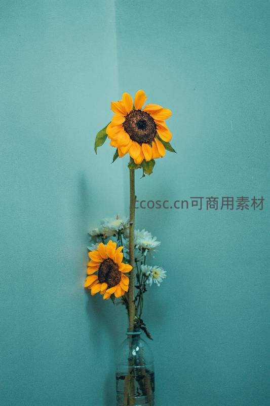 一支向日葵与几朵小白花插在透明玻璃瓶中,倚靠在纯净的蓝色墙壁旁,简洁的画面充满宁静的艺术感。