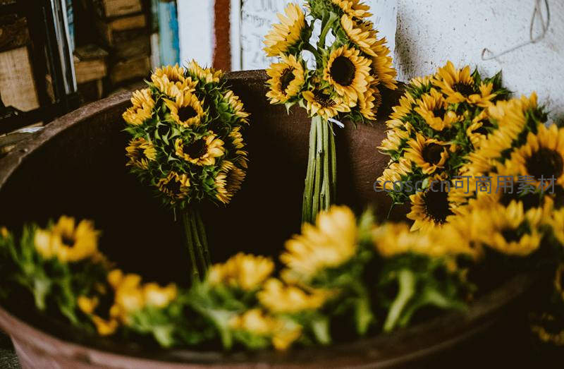 几个用绳子捆扎好的向日葵花束整齐地摆放在一个古朴的陶盆里,仿佛正等待被带回家,充满了市井生活的烟火气。