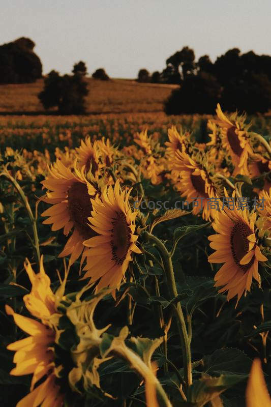 黄昏时分,大片向日葵沐浴在金色余晖中,远处山丘与树林勾勒出宁静田园画卷,温暖而治愈。